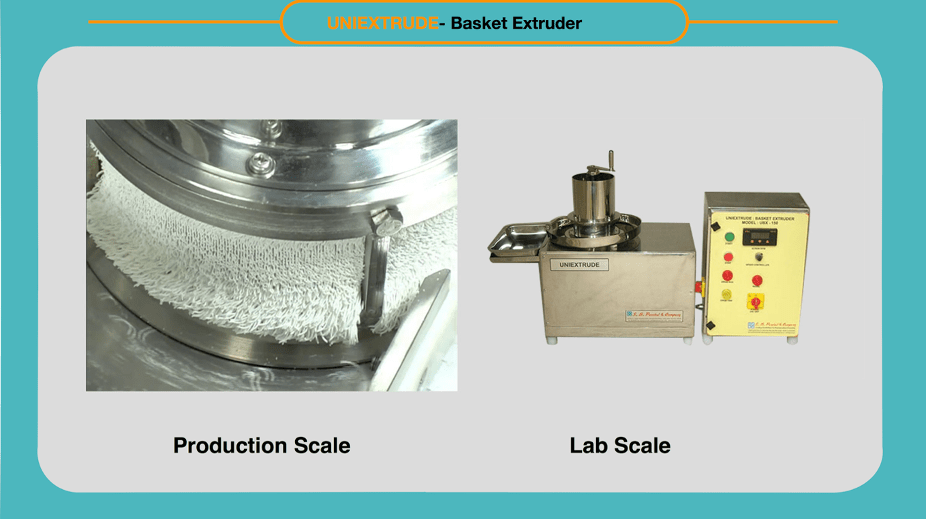 اکسترودرهای سبدی، اکسترودرهای عمودی هستند. رولرهایی که به صورت عمودی می چرخند، توده ی فرموله شده را فشار می دهد تا از بین مش های سوراخدار عبور کند.